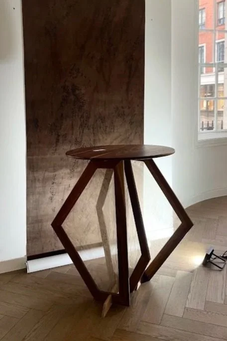 A collaboration with bespoke textile designer Antonia Claudie, this walnut table draws inspiration from the deconstructed wings of a butterfly. The silk inserts, hand-dyed by Antonia using natural walnut husks, are seamlessly integrated into the wooden frame, creating a delicate contrast between the materials.